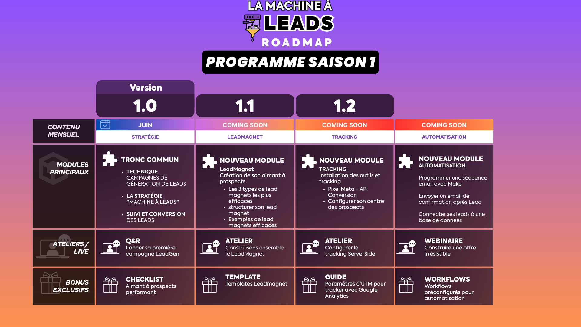 👉 Tu rejoins une Saison complète (Saison 1), qui te débloque du contenu régulièrement pour construire ta Machine à Leads sans te sentir débordé.